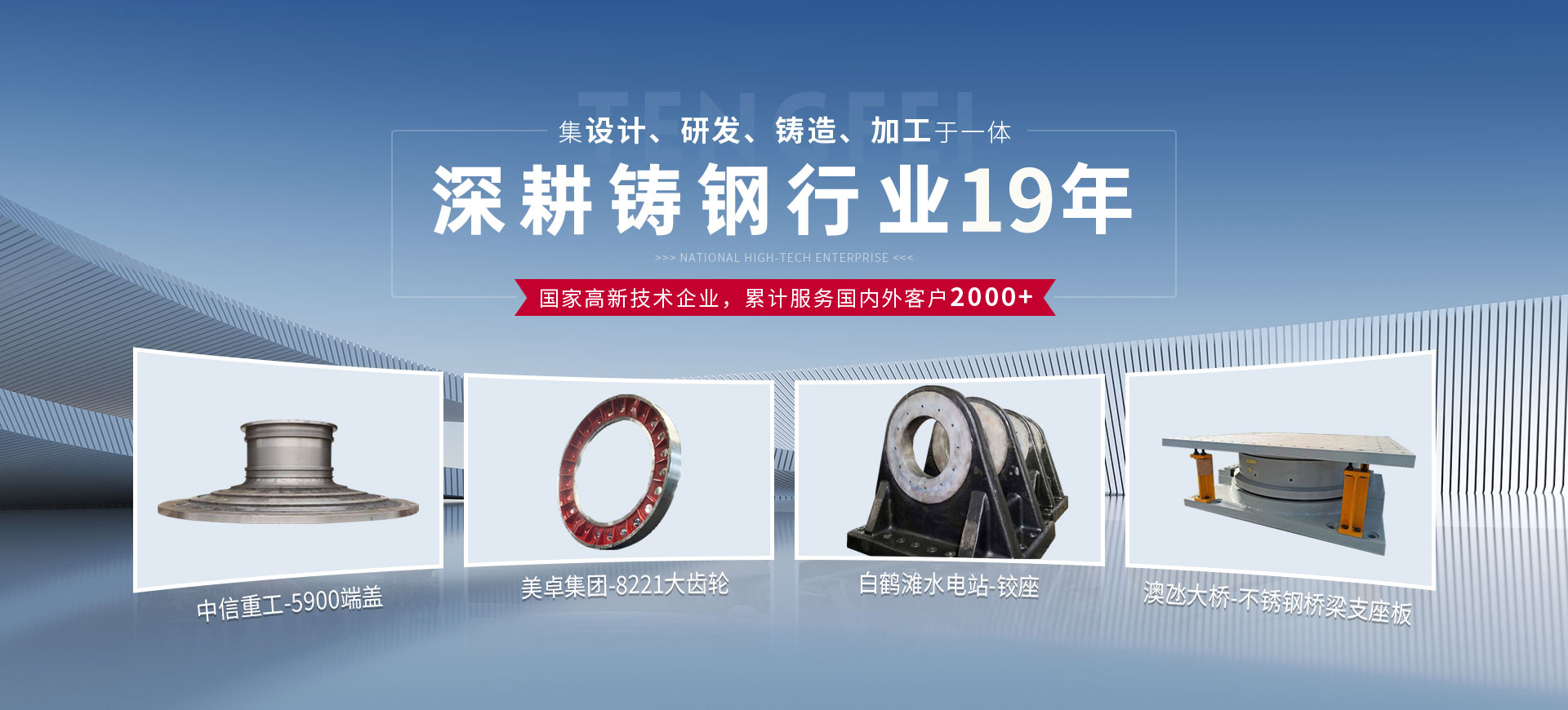 騰飛鑄鋼成立于2006年,位于全國鑄造基地河南省新鄉市,擁有員工300余人,是一家從事150噸以下碳鋼、低合金鋼、不銹鋼鑄鋼件研發、制造、服務為一體的國家高新技術企業?! 」就ㄟ^了ISO9001國際質量管理體系認證,擁有2項發明專 利,2項河南省科技成果、25項實用新型技術,通過了“環??冃гu級B級企業”驗收,先后榮獲“河南省鑄造行業綠色發展企業”、 “河南省科技型中小企業”、“河南省專精特新中小企業”等榮譽稱號?! 」緭碛?臺25噸電爐,4臺大型天燃氣熱處理爐、10米回旋自動拋丸機一臺, φ8m數控立車、φ10m數控滾齒機等各類高精裝備100余臺套,年產能3萬余噸,能為客戶提供從產品設計、木模加工、大型鑄造、大型加工一站式服務,產品廣泛應用于建材、冶金、鍛壓、冶金、水工、路橋、化工等多個重型行業。  長期服務于中信重工、中船重工、美卓、上海中交、萊歇、寶武、濟南重工等全球知名企業,在行業內擁有較高的市場知名度和美譽度。